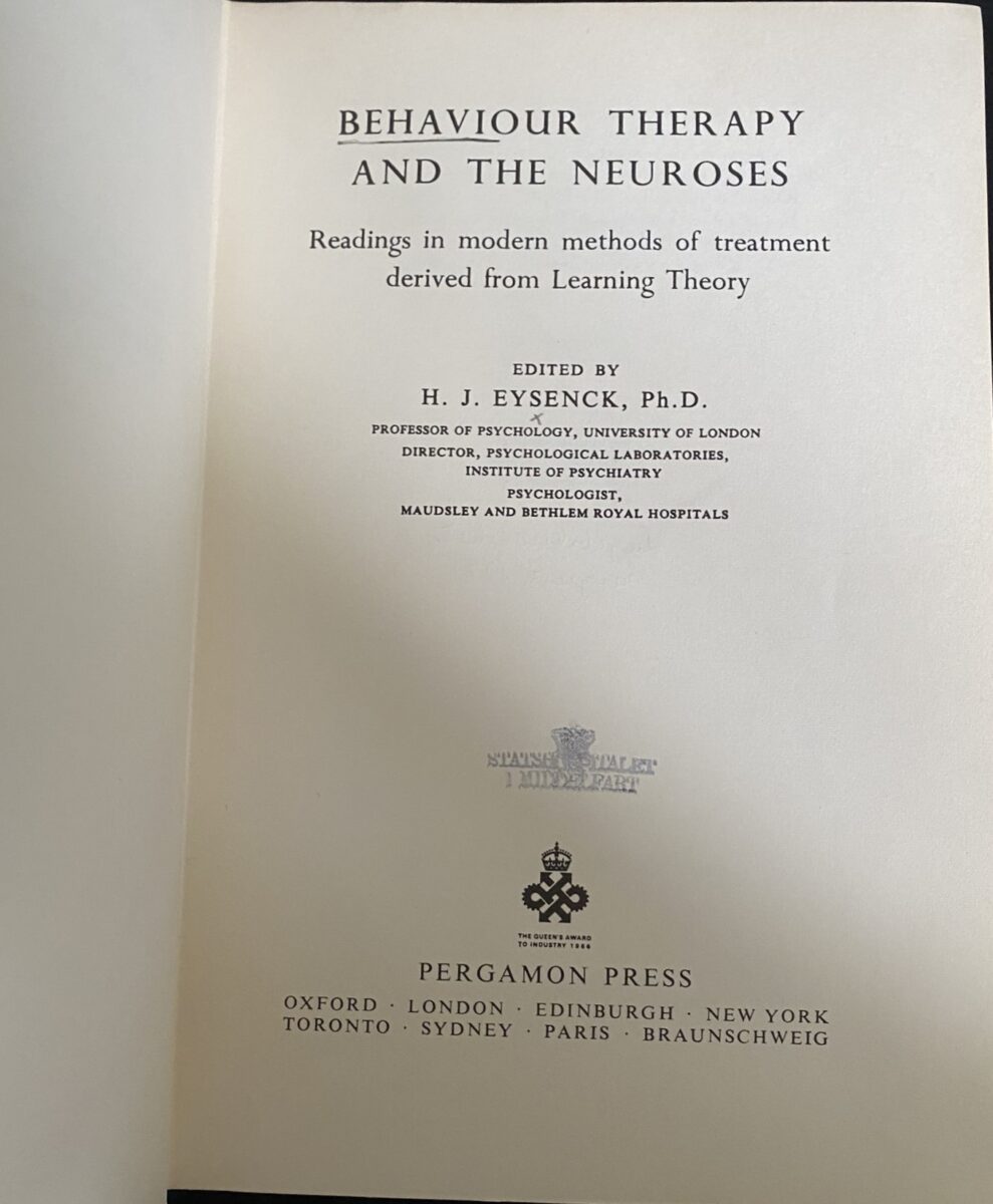 In 1967, Hans J. Eysenck published *Behaviour Therapy and the Neuroses: Readings in Modern Methods of Treatment Derived from Learning Theory*. This book compiled various studies and readings that explored the application of behavior therapy to treat neuroses.